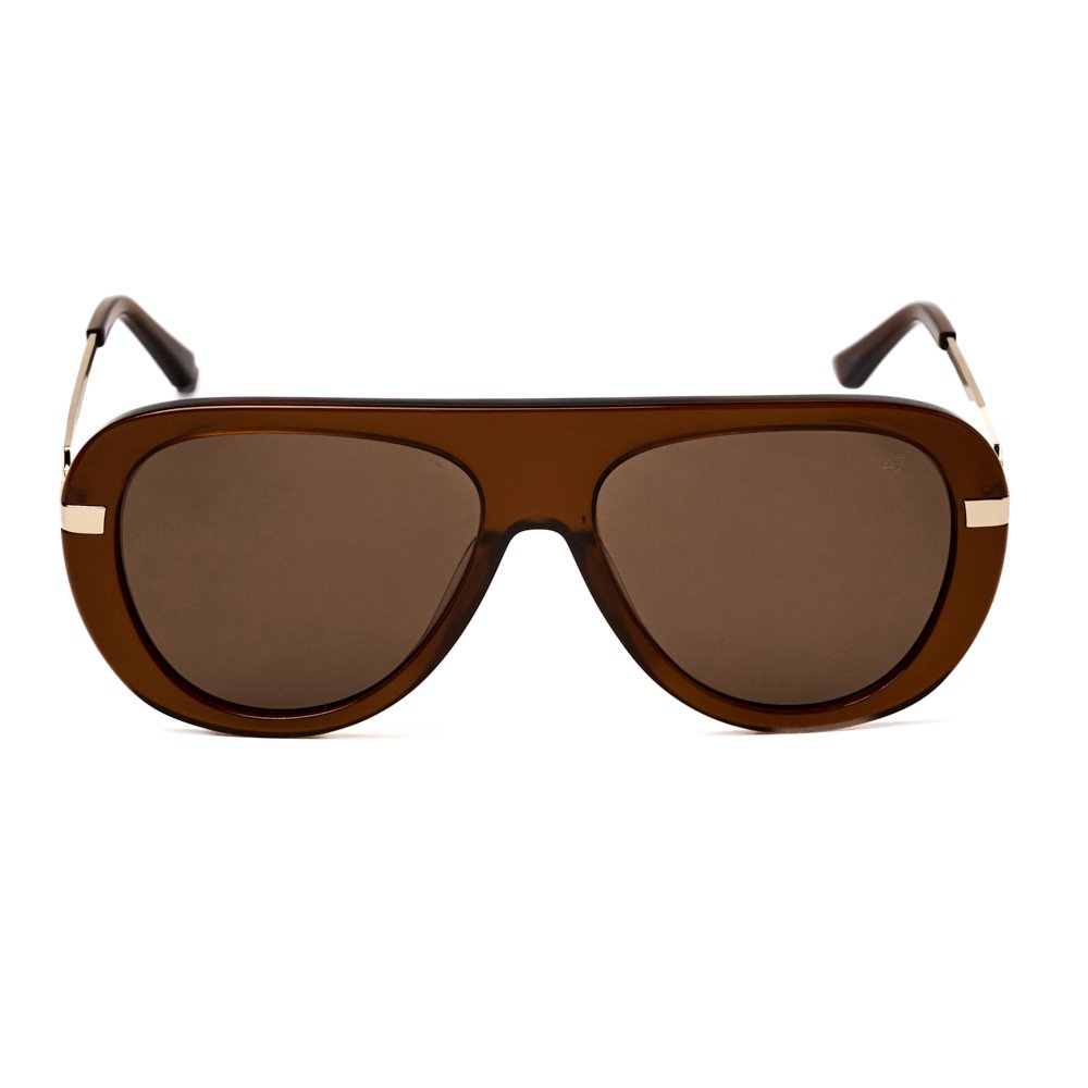 A bold, architectural silhouette designed with refined detailing. ALEXIA in Brown features a warm transparent acetate front paired with gold-tone metal temples and deep brown lenses. Strong in structure yet elegant in finish, it blends modern attitude with timeless sophistication. Best suited for medium to wide faces.