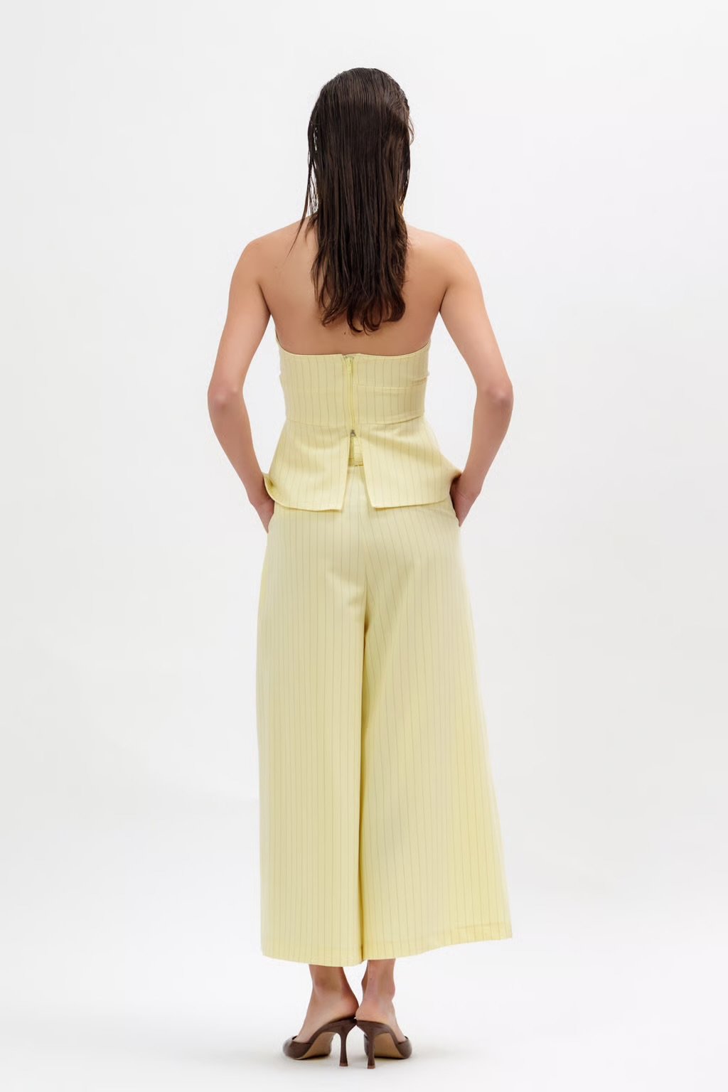 Ψηλόμεση ζιπ κιλότ με ρίγες, άνετη σε ίσια γραμμή. Διαθέτει τσέπες μπροστά και πίσω φιλέτο. Κουμπώνει με φερμουάρ.